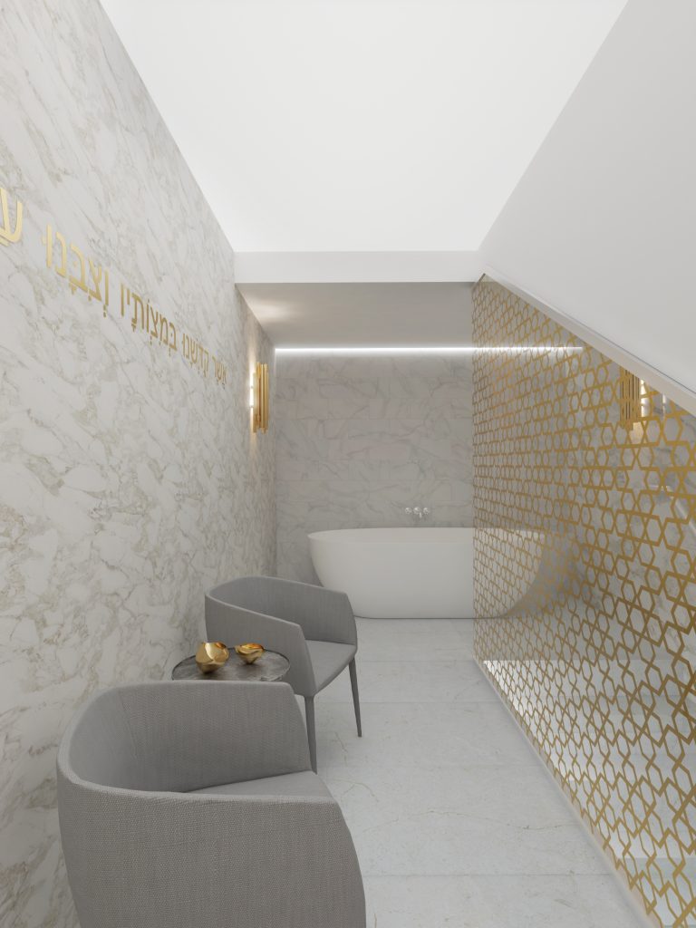 Die Badeeinrichtung wurde als Teil des Umbaus eines bestehenden Gebäudes entworfen. Neben der Schaffung eines modernen, hochwertigen Interieurs war es unser Ziel, auf die jüdische Tradition zurückzugreifen und auf ihre rituelle Funktion zu verweisen. Die mit Marmor verkleidete Wand zeigt den Segen des Untertauchens, während die undurchsichtige Glasfläche mit einem geometrischen Muster aus sich wiederholenden Sternenmotiven verziert ist, um die Beobachtung der Badegäste zu verhindern.