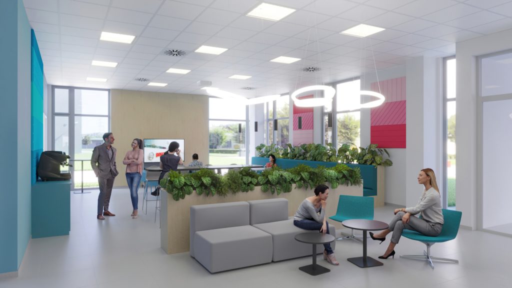 Bosch Building no. 102, laboratory level area. Ground floor of existing building was partially reconstructed. In areas affected by reconstruction the following were created: a laboratory, community spaces as well as spaces based on the "New Ways of Working" (NWW) methodology.
