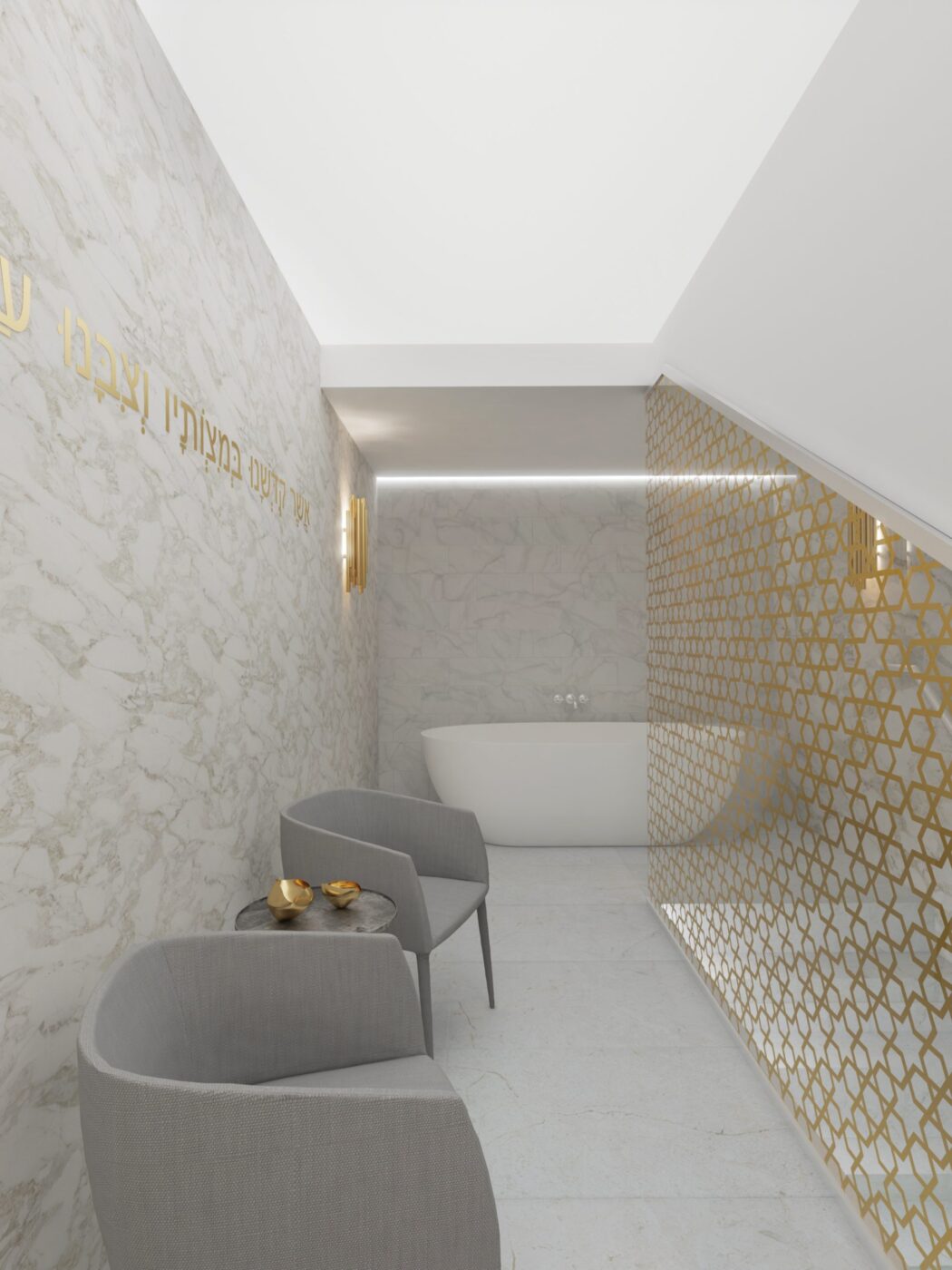 A fürdőhelyiséget egy meglévő épület átalakításának részeként terveztük. A modern, magas minőségű enteriőr létrehozása mellett célunk volt visszanyúlni a zsidó hagyományokhoz, utalni a rituális funkcióra. A márványburkolatú falon megjelenik a megmerülés áldása, az üvegfelületen pedig a csillagmotívum ismétlődésével alakul ki a betekintést megakadályozó geometrikus mintázat.